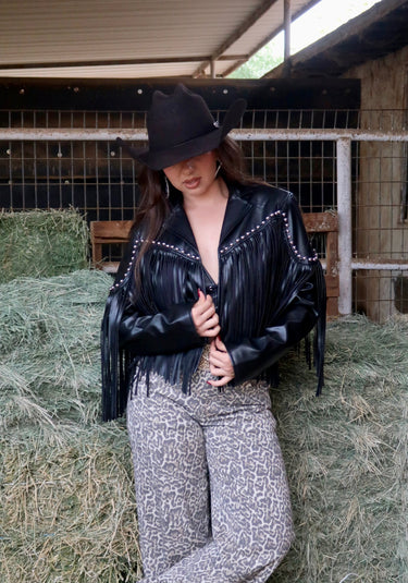 Make a statement with this glossy black leather fringe jacket with gleaming silver studs that bring out the western edge. Perfect for concerts, rodeos, events, or an elevated look.