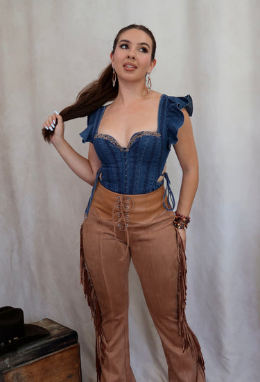 Chambray denim corset top with embroidered details all around, ruffle short sleeve, hook closure corset front, side cutouts with tie accents, and ruffle hem.