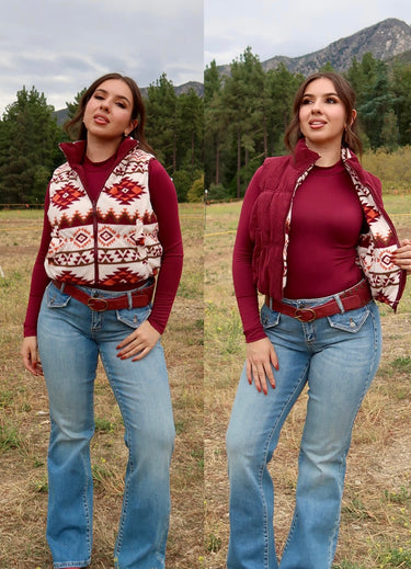 The ultimate 2 in 1 cropped western vest featuring an aztec print on one side and a solid color on the other side along with pockets.